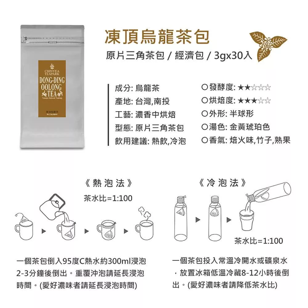 1.商品組合/規格:凍頂烏龍茶包30入經濟包2.商品品名:凍頂烏龍茶包特惠組3.商品重(容)量:30入(90g)x3袋4.內容物名稱(成分):烏龍茶5.食品添加物名稱:無6.原產地(國):台灣