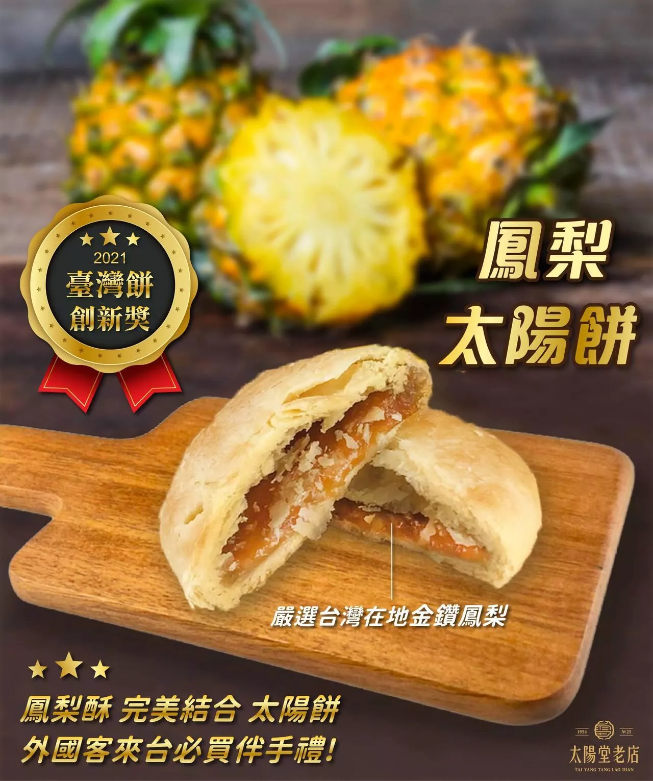 太陽堂老店鳳梨太陽餅,於110年榮獲台灣餅創新獎,創新口感結合土鳳梨餡,酸甜不膩口,為台灣伴手禮首選!